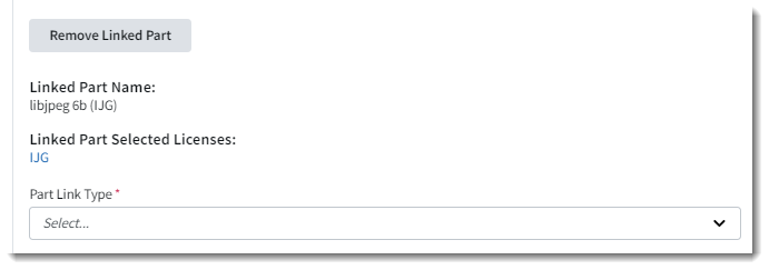 Additionally, the Link Part button is replaced with a Remove Linked Part button. - From the Part Link Type dropdown list, select the value that identifies the relationship between the current part (the part that you are creating or editing) and the linked part. The current part is always the first element in the relationship syntax. For example, if you select the type Build Dependency of, the relationship syntax reads “the currentPart is a build dependency of the linkedPart”. The available link types are based on SPDX and CycloneDX specifications for identifying relationships between open-source, third-party, and commercial components in software. For a description of the relationships, refer to SPDX Specification, Clause 11: Relationship between SPDX Elements Information.